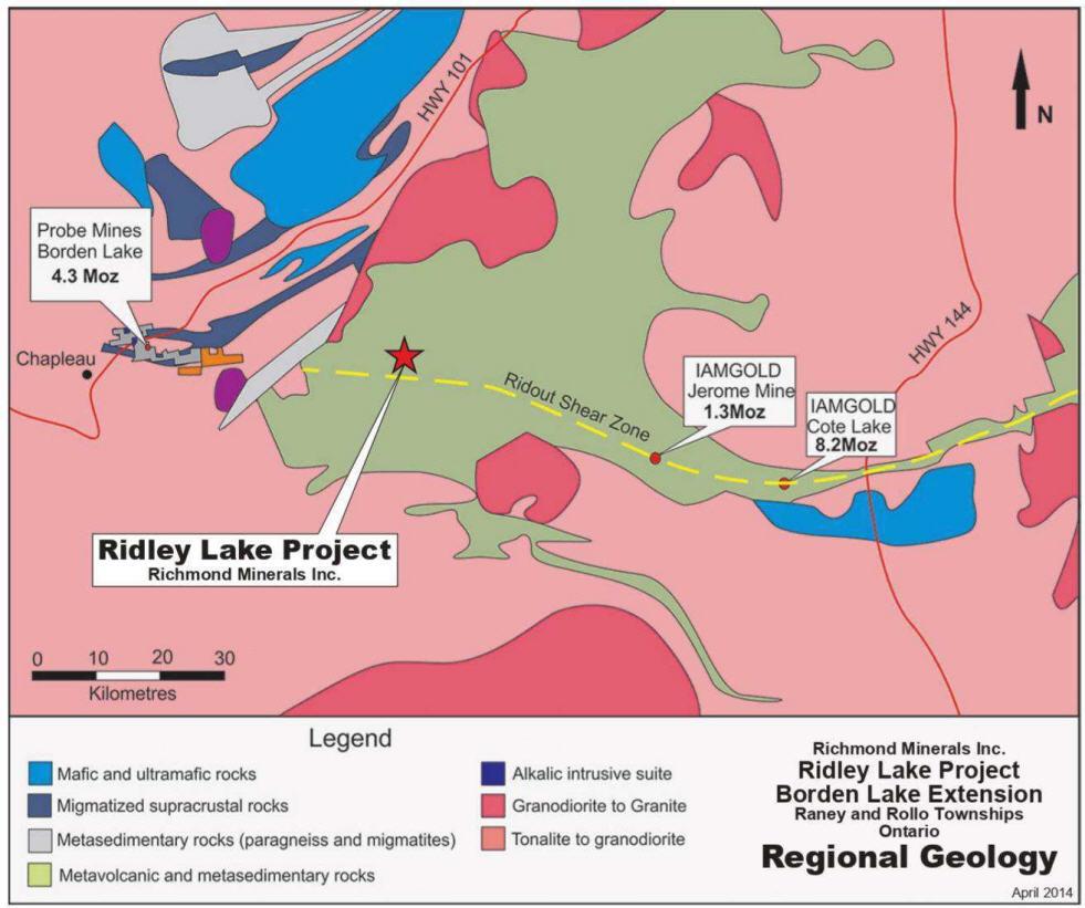 Half a world away, Richmond Minerals’ other development-stage exploration focus is occurring at its Ridley Lake Gold Project, located in the heart of north-central Ontario’s Swayze Greenstone Belt, 120 kilometres west-southwest of the historic mining city of Timmins. Covering an eight kilometer section of the Ridout Shear Zone (the RSZ) and consisting of a contiguous unpatented single cell and boundary mining claims, Richmond owns a 100% interest in the project.
